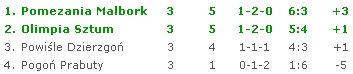 Dużo lepiej niż jesienią 2009 roku wygląda nasza sytuacja w małej tabelce derbowej. Wtedy to po 3 spotkaniach mieliśmy zaledwie 1 punkt wywalczony na własnym boisku z Pomezanią Malbork. Aktualnie mamy 5 'oczek' i ustępujemy liderującej Pomezanii jedynie gorszym bilansem bezpośredniego meczu.